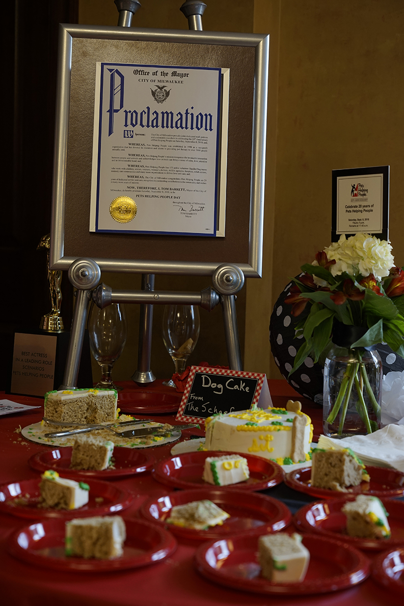 Mayor Tom Barrett proclaimed September 8th at Pets Helping People day. On that date, we gathered together and celebrated 20 years of Pets Helping People. With a nod to our past, co-founders Cyndy Scherrer, Dr. Jennifer Bloss and Angie Rester and a recognition of our incredible training team, Waggin\’Tails coordinators and board members, we celebrated all the accomplishments of PHP.
